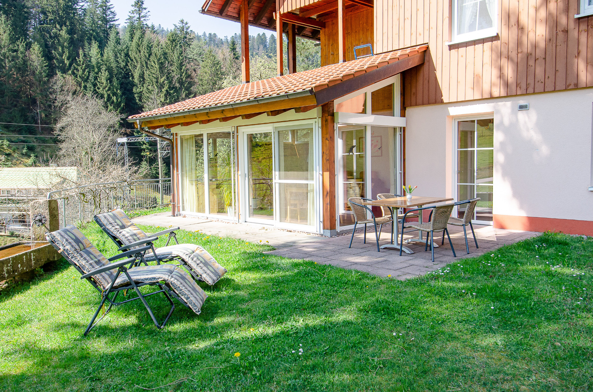 Ebenerdig, behindertengerechtes Bad und Schlafzimmer, Terrasse-Liegewiese mit Brunnen, 2 Schlafzimmer, großes Bad und extra Toilette, Wohnzimmer und Küche mit Terrassentüren, zusätzliche Schlafcouch möglich